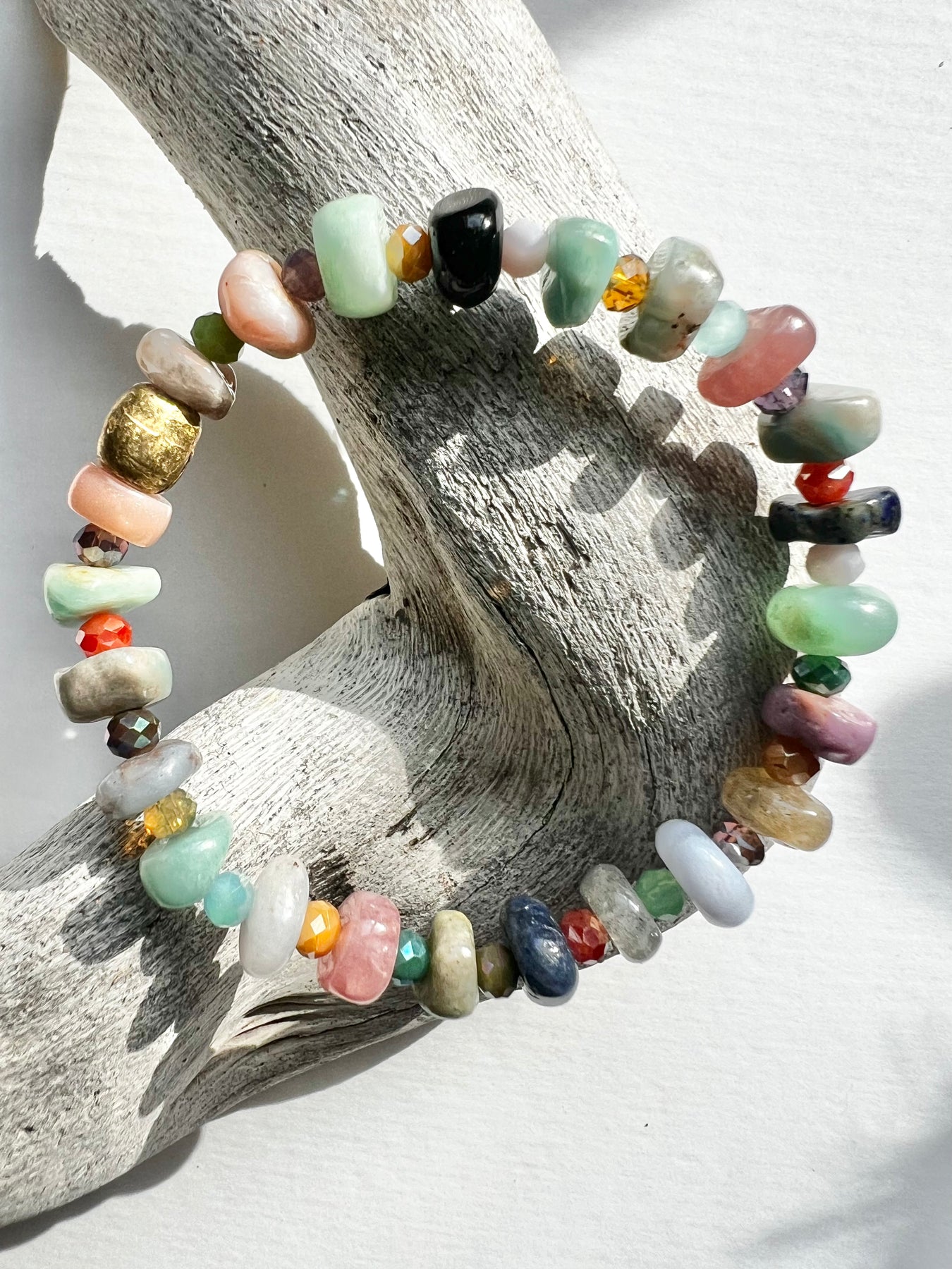 An easy, everyday bracelet made with an assortment of organic-shaped gems that look like smooth little pebbles. With tiny crystals between each one, the tones are soft and wearable with a subtle sparkle. This piece plays well with absolutely everything!